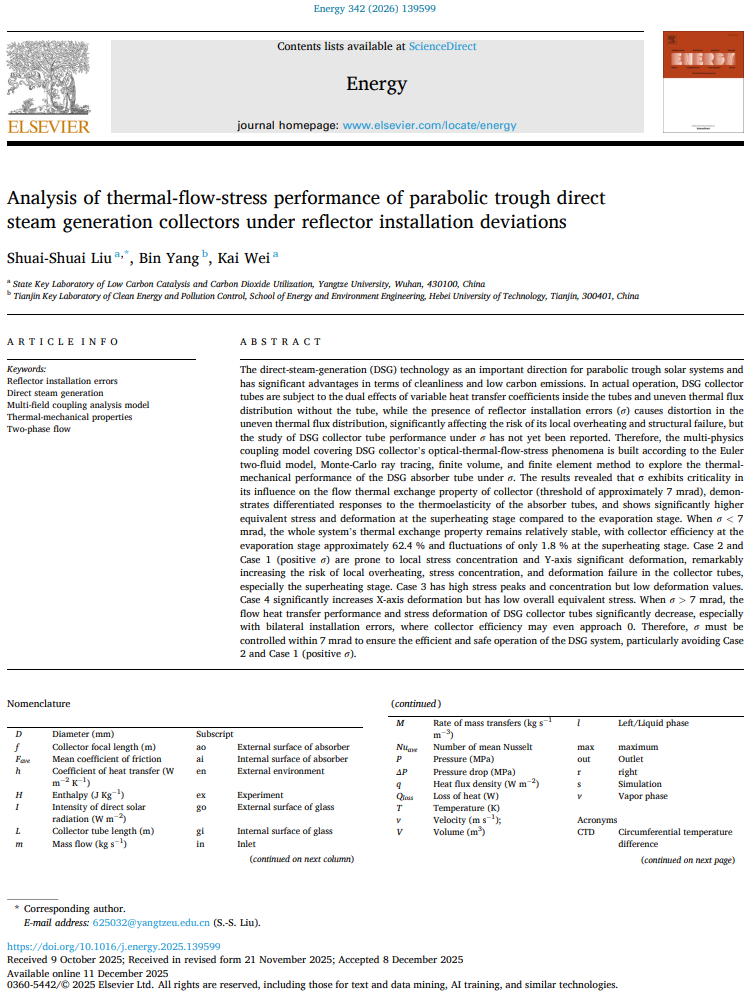 近日,石油工程学院刘帅帅副教授在国际知名能源期刊《Energy》发表了题为“Analysis of thermal-flow-stress performance of parabolic trough direct steam generation collectors under reflector installation deviations”的文章,文章共16页,图18幅。该研究针对直接蒸汽发生(DSG)槽式集热器在实际运行中普遍存在但尚未被系统研究的反射镜安装偏差问题,开展了深入的多物理场耦合分析,揭示了安装误差对集热器热-流-应力性能的影响规律,并提出了关键控制阈值。该成果为提升DSG系统的运行效率与安全性提供了重要的理论依据。