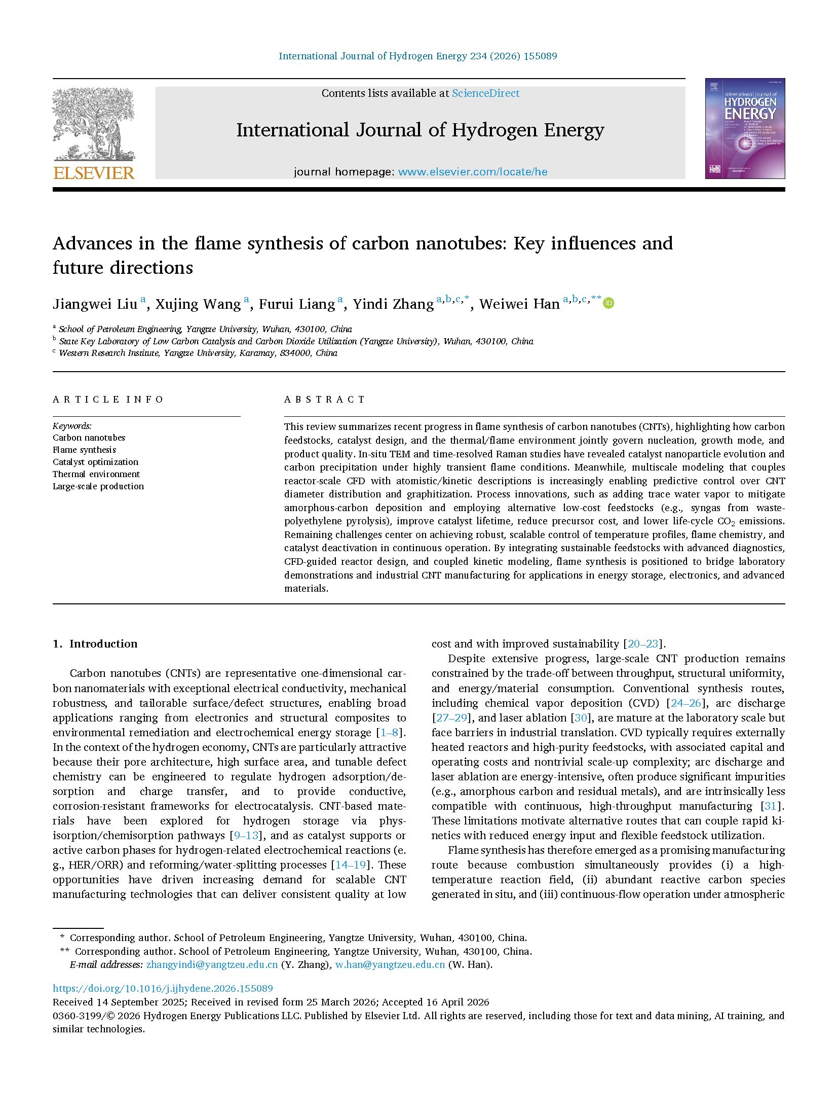 (通讯员 韩伟伟)近日,石油工程学院本科生刘将为以第一作者身份在中科院二区TOP期刊《International Journal of Hydrogen Energy》(IF=8.3)发表题为“Advances in the flame synthesis of carbon nanotubes: Key influences and future directions”的综述文章。yl8858永利集团石油工程学院为论文第一署名单位,石油工程学院新能源系本科生刘将为是论文第一作者,韩伟伟老师为通讯作者,论文是在韩伟伟/张引弟老师共同指导下完成。